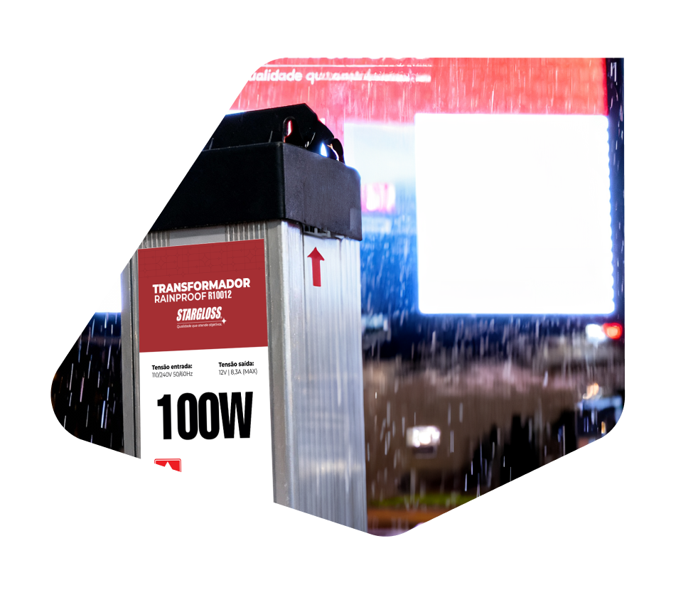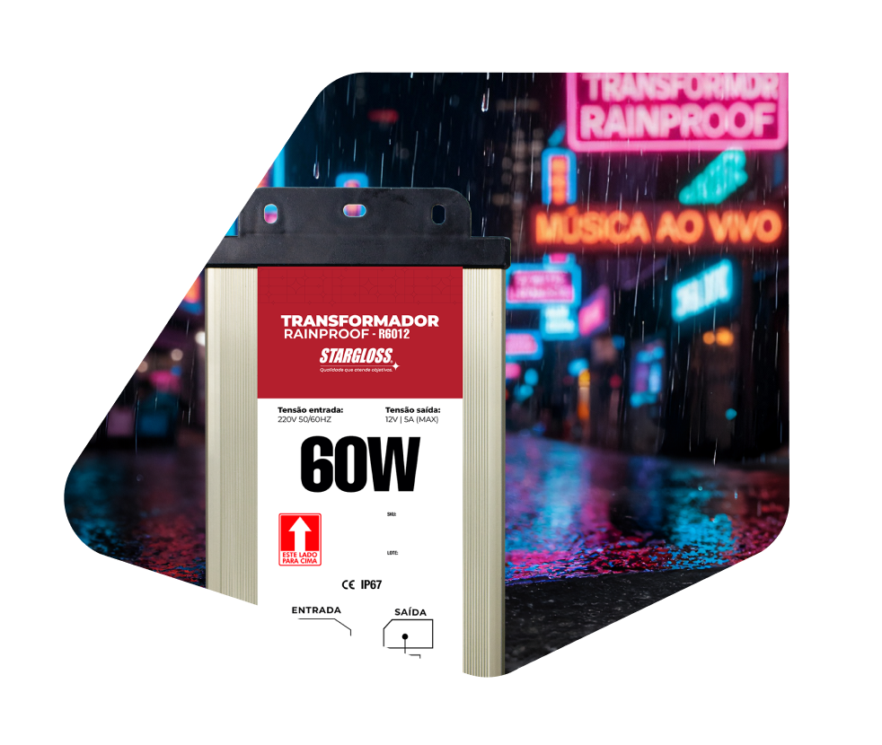 A Linha Waterproof Stargloss reúne transformadores com entrada bivolt (110/240V) e saída regulada de 12V DC, projetados para aplicações externas que exigem proteção total contra água e poeira.